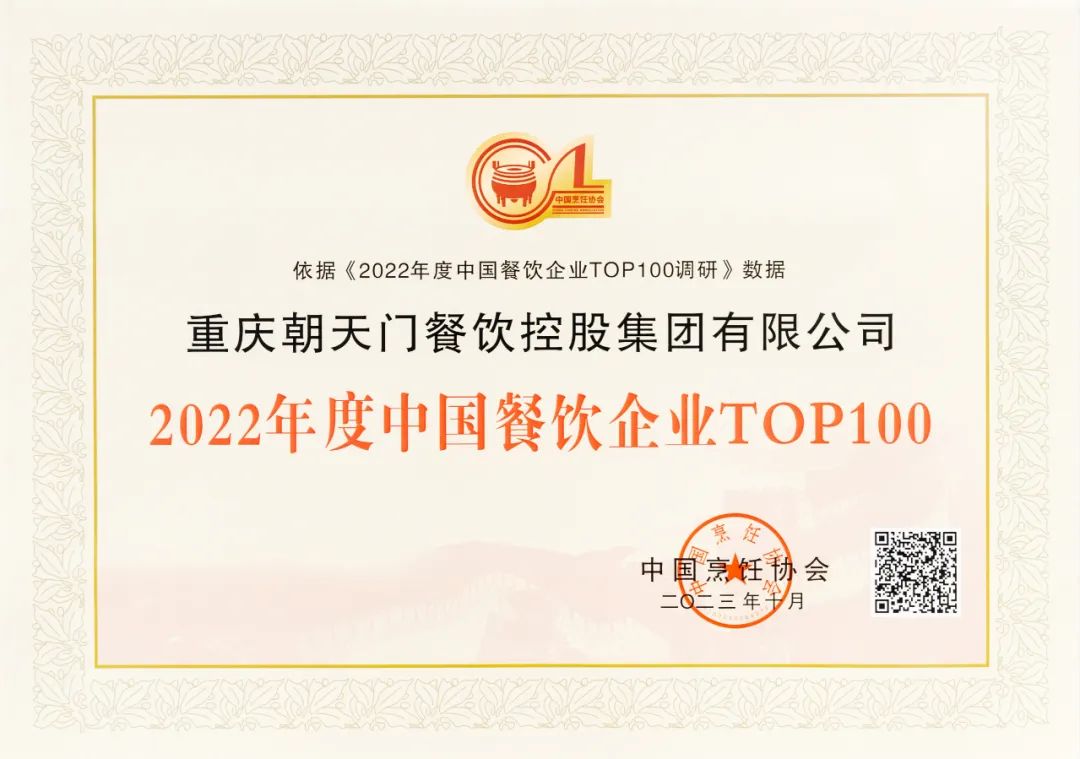 2022年度中國餐飲企業TOP100第七名,朝天門餐飲控股集團連續11年獲此殊榮!